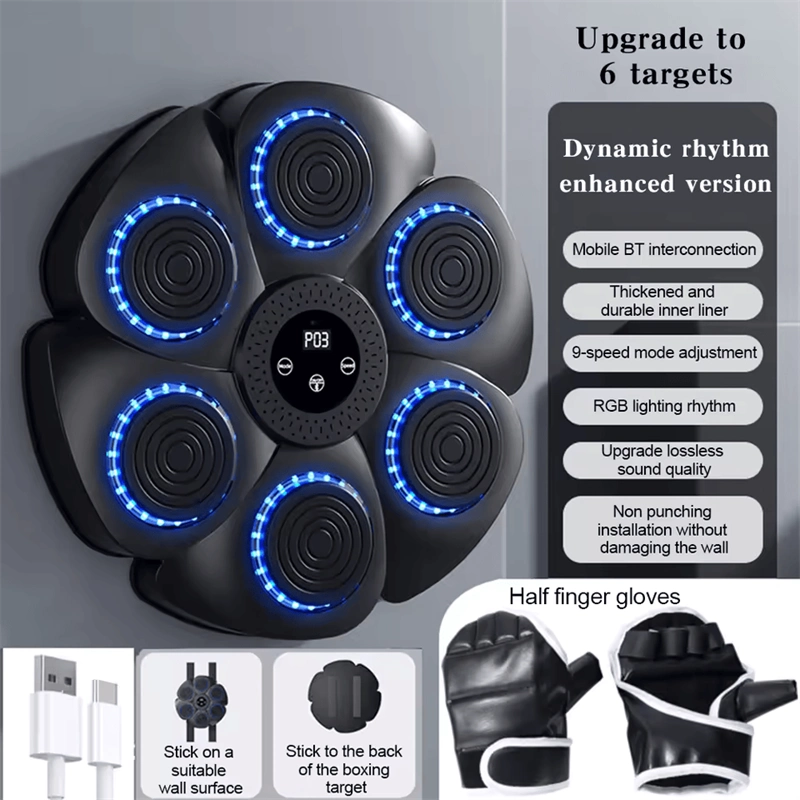 A:The music boxing machine features interactive LED lights, Bluetooth connectivity for music playback, multiple training modes, and an ergonomic design for both adults and children. It is designed to make workouts fun and engaging.